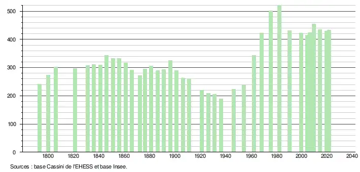 L'évolution du nombre d'habitants est connue à travers les recensements de la population effectués dans la commune depuis 1793. Pour les communes de moins de 10 000 habitants, une enquête de recensement portant sur toute la population est réalisée tous les cinq ans, les populations légales des années intermédiaires étant quant à elles estimées par interpolation ou extrapolation[22]. Pour la commune, le premier recensement exhaustif entrant dans le cadre du nouveau dispositif a été réalisé en 2004[23].