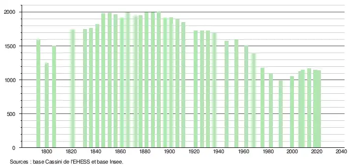 L'évolution du nombre d'habitants est connue à travers les recensements de la population effectués dans la commune depuis 1793. Pour les communes de moins de 10 000 habitants, une enquête de recensement portant sur toute la population est réalisée tous les cinq ans, les populations légales des années intermédiaires étant quant à elles estimées par interpolation ou extrapolation[28]. Pour la commune, le premier recensement exhaustif entrant dans le cadre du nouveau dispositif a été réalisé en 2008[29].