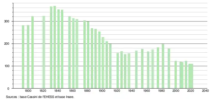L'évolution du nombre d'habitants est connue à travers les recensements de la population effectués dans la commune depuis 1793. Pour les communes de moins de 10 000 habitants, une enquête de recensement portant sur toute la population est réalisée tous les cinq ans, les populations légales des années intermédiaires étant quant à elles estimées par interpolation ou extrapolation[24]. Pour la commune, le premier recensement exhaustif entrant dans le cadre du nouveau dispositif a été réalisé en 2008[25].