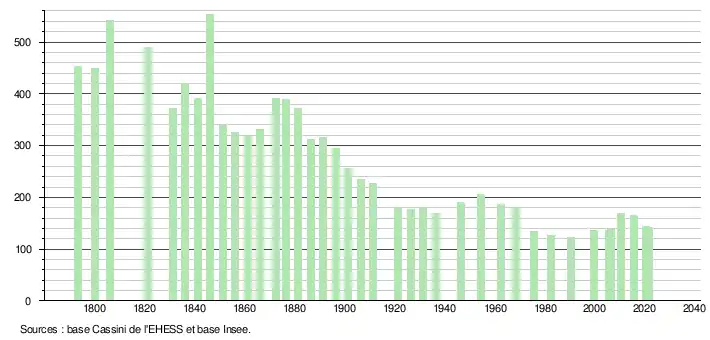 L'évolution du nombre d'habitants est connue à travers les recensements de la population effectués dans la commune depuis 1793. Pour les communes de moins de 10 000 habitants, une enquête de recensement portant sur toute la population est réalisée tous les cinq ans, les populations légales des années intermédiaires étant quant à elles estimées par interpolation ou extrapolation[19]. Pour la commune, le premier recensement exhaustif entrant dans le cadre du nouveau dispositif a été réalisé en 2005[20].