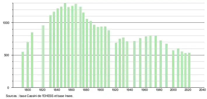 L'évolution du nombre d'habitants est connue à travers les recensements de la population effectués dans la commune depuis 1793. Pour les communes de moins de 10 000 habitants, une enquête de recensement portant sur toute la population est réalisée tous les cinq ans, les populations légales des années intermédiaires étant quant à elles estimées par interpolation ou extrapolation[27]. Pour la commune, le premier recensement exhaustif entrant dans le cadre du nouveau dispositif a été réalisé en 2006[28].