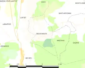 Les communes les plus proches[Note 1] sont[4] : Lortet (0,9 km), Mazouau (1,5 km), Saint-Arroman (2,0 km), Hèches (2,2 km), Labastide (2,3 km), Gazave (2,9 km), Izaux (3,0 km), Montoussé (4,4 km).