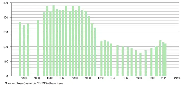 L'évolution du nombre d'habitants est connue à travers les recensements de la population effectués dans la commune depuis 1793. Pour les communes de moins de 10 000 habitants, une enquête de recensement portant sur toute la population est réalisée tous les cinq ans, les populations légales des années intermédiaires étant quant à elles estimées par interpolation ou extrapolation[27]. Pour la commune, le premier recensement exhaustif entrant dans le cadre du nouveau dispositif a été réalisé en 2008[28].