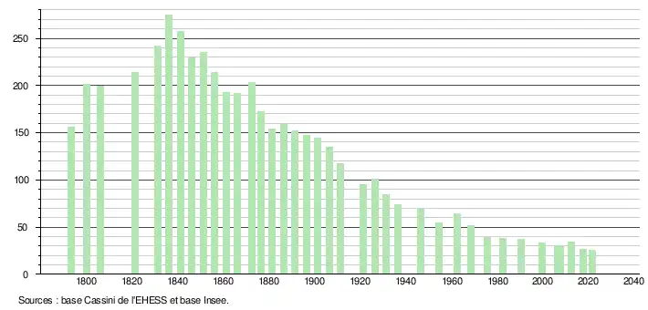 L'évolution du nombre d'habitants est connue à travers les recensements de la population effectués dans la commune depuis 1793. Pour les communes de moins de 10 000 habitants, une enquête de recensement portant sur toute la population est réalisée tous les cinq ans, les populations légales des années intermédiaires étant quant à elles estimées par interpolation ou extrapolation[15]. Pour la commune, le premier recensement exhaustif entrant dans le cadre du nouveau dispositif a été réalisé en 2007[16].