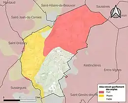 Le retrait-gonflement des sols argileux est susceptible d'engendrer des dommages importants aux bâtiments en cas d’alternance de périodes de sécheresse et de pluie. 70 % de la superficie communale est en aléa moyen ou fort (59,3 % au niveau départemental et 48,5 % au niveau national). Sur les 626 bâtiments dénombrés sur la commune en 2019, 192 sont en aléa moyen ou fort, soit 31 %, à comparer aux 85 % au niveau départemental et 54 % au niveau national. Une cartographie de l'exposition du territoire national au retrait gonflement des sols argileux est disponible sur le site du BRGM[18],[Carte 2].