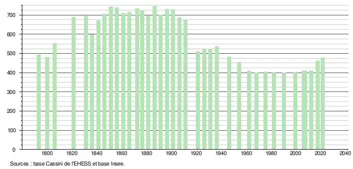 L'évolution du nombre d'habitants est connue à travers les recensements de la population effectués dans la commune depuis 1793. Pour les communes de moins de 10 000 habitants, une enquête de recensement portant sur toute la population est réalisée tous les cinq ans, les populations légales des années intermédiaires étant quant à elles estimées par interpolation ou extrapolation[19]. Pour la commune, le premier recensement exhaustif entrant dans le cadre du nouveau dispositif a été réalisé en 2007[20].