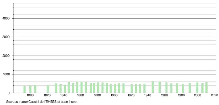 L'évolution du nombre d'habitants est connue à travers les recensements de la population effectués dans la commune depuis 1793. À partir du , les populations légales des communes sont publiées annuellement dans le cadre d'un recensement qui repose désormais sur une collecte d'information annuelle, concernant successivement tous les territoires communaux au cours d'une période de cinq ans. Pour les communes de moins de 10 000 habitants, une enquête de recensement portant sur toute la population est réalisée tous les cinq ans, les populations légales des années intermédiaires étant quant à elles estimées par interpolation ou extrapolation[5]. Pour la commune, le premier recensement exhaustif entrant dans le cadre du nouveau dispositif a été réalisé en 2005[6],[Note 1].