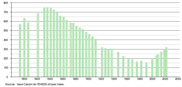 L'évolution du nombre d'habitants est connue à travers les recensements de la population effectués dans la commune depuis 1793. Pour les communes de moins de 10 000 habitants, une enquête de recensement portant sur toute la population est réalisée tous les cinq ans, les populations légales des années intermédiaires étant quant à elles estimées par interpolation ou extrapolation[29]. Pour la commune, le premier recensement exhaustif entrant dans le cadre du nouveau dispositif a été réalisé en 2008[30].