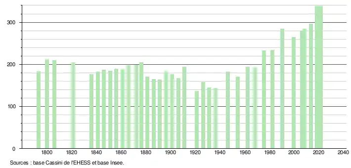 L'évolution du nombre d'habitants est connue à travers les recensements de la population effectués dans la commune depuis 1793. Pour les communes de moins de 10 000 habitants, une enquête de recensement portant sur toute la population est réalisée tous les cinq ans, les populations légales des années intermédiaires étant quant à elles estimées par interpolation ou extrapolation[26]. Pour la commune, le premier recensement exhaustif entrant dans le cadre du nouveau dispositif a été réalisé en 2008[27].