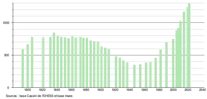 L'évolution du nombre d'habitants est connue à travers les recensements de la population effectués dans la commune depuis 1793. Pour les communes de moins de 10 000 habitants, une enquête de recensement portant sur toute la population est réalisée tous les cinq ans, les populations légales des années intermédiaires étant quant à elles estimées par interpolation ou extrapolation[29]. Pour la commune, le premier recensement exhaustif entrant dans le cadre du nouveau dispositif a été réalisé en 2004[30].