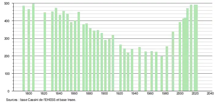 L'évolution du nombre d'habitants est connue à travers les recensements de la population effectués dans la commune depuis 1793. Pour les communes de moins de 10 000 habitants, une enquête de recensement portant sur toute la population est réalisée tous les cinq ans, les populations légales des années intermédiaires étant quant à elles estimées par interpolation ou extrapolation[16]. Pour la commune, le premier recensement exhaustif entrant dans le cadre du nouveau dispositif a été réalisé en 2004[17].