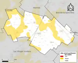 Le retrait-gonflement des sols argileux est susceptible d'engendrer des dommages importants aux bâtiments en cas d’alternance de périodes de sécheresse et de pluie. 35,8 % de la superficie communale est en aléa moyen ou fort (52,8 % au niveau départemental et 48,5 % au niveau national). Sur les 156 bâtiments dénombrés sur la commune en 2019, 37 sont en aléa moyen ou fort, soit 24 %, à comparer aux 70 % au niveau départemental et 54 % au niveau national. Une cartographie de l'exposition du territoire national au retrait gonflement des sols argileux est disponible sur le site du BRGM[20],[Carte 2].