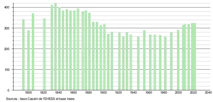 L'évolution du nombre d'habitants est connue à travers les recensements de la population effectués dans la commune depuis 1793. Pour les communes de moins de 10 000 habitants, une enquête de recensement portant sur toute la population est réalisée tous les cinq ans, les populations légales des années intermédiaires étant quant à elles estimées par interpolation ou extrapolation[24]. Pour la commune, le premier recensement exhaustif entrant dans le cadre du nouveau dispositif a été réalisé en 2008[25].