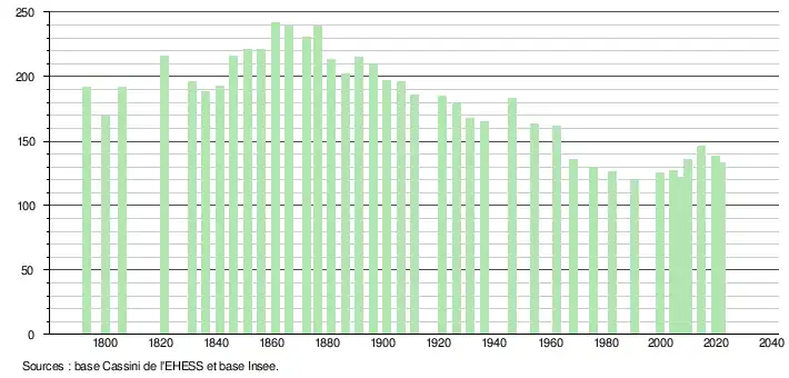 L'évolution du nombre d'habitants est connue à travers les recensements de la population effectués dans la commune depuis 1793. Pour les communes de moins de 10 000 habitants, une enquête de recensement portant sur toute la population est réalisée tous les cinq ans, les populations légales des années intermédiaires étant quant à elles estimées par interpolation ou extrapolation[40]. Pour la commune, le premier recensement exhaustif entrant dans le cadre du nouveau dispositif a été réalisé en 2004[41].
