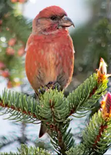 Le Bec-croisé des sapins est un granivore spécialisé, les mandibules croisées décortiquant les cônes pour en extraire les semences ailées.