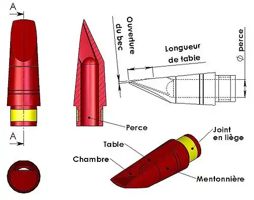 - la table est la surface d'accueil de l’anche ; elle est l'association de deux surfaces : une surface plane recevant le talon ou partie fixe de l'anche, et une autre, courbe dessinant l'ouverture du bec.