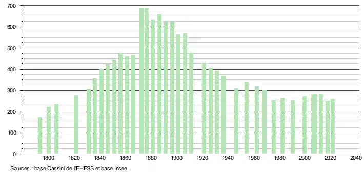 L'évolution du nombre d'habitants est connue à travers les recensements de la population effectués dans la commune depuis 1793. Pour les communes de moins de 10 000 habitants, une enquête de recensement portant sur toute la population est réalisée tous les cinq ans, les populations légales des années intermédiaires étant quant à elles estimées par interpolation ou extrapolation[24]. Pour la commune, le premier recensement exhaustif entrant dans le cadre du nouveau dispositif a été réalisé en 2007[25].