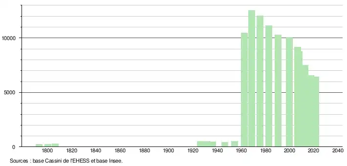 L'évolution du nombre d'habitants est connue à travers les recensements de la population effectués dans la commune depuis 1793. Pour les communes de moins de 10 000 habitants, une enquête de recensement portant sur toute la population est réalisée tous les cinq ans, les populations légales des années intermédiaires étant quant à elles estimées par interpolation ou extrapolation[30]. Pour la commune, le premier recensement exhaustif entrant dans le cadre du nouveau dispositif a été réalisé en 2007[31].