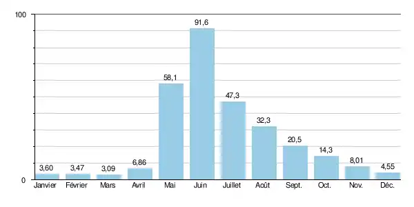 En considérant la seule période estivale, libre de glaces (de mai à septembre inclus), le débit mensuel minimal observé a été de 13,7 m3/s en , ce qui restait très confortable.