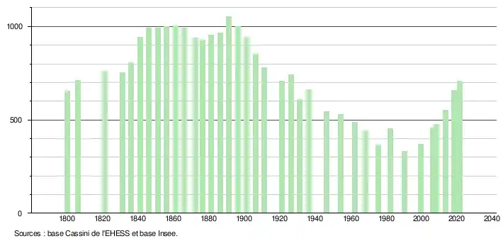L'évolution du nombre d'habitants est connue à travers les recensements de la population effectués dans la commune depuis 1800. Pour les communes de moins de 10 000 habitants, une enquête de recensement portant sur toute la population est réalisée tous les cinq ans, les populations légales des années intermédiaires étant quant à elles estimées par interpolation ou extrapolation[21]. Pour la commune, le premier recensement exhaustif entrant dans le cadre du nouveau dispositif a été réalisé en 2008[22].