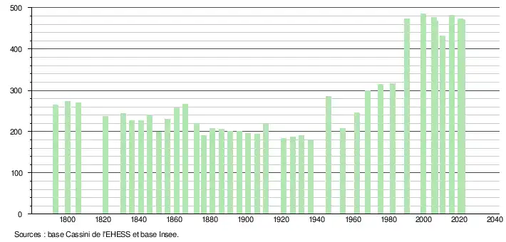 L'évolution du nombre d'habitants est connue à travers les recensements de la population effectués dans la commune depuis 1793. Pour les communes de moins de 10 000 habitants, une enquête de recensement portant sur toute la population est réalisée tous les cinq ans, les populations légales des années intermédiaires étant quant à elles estimées par interpolation ou extrapolation[29]. Pour la commune, le premier recensement exhaustif entrant dans le cadre du nouveau dispositif a été réalisé en 2005[30].