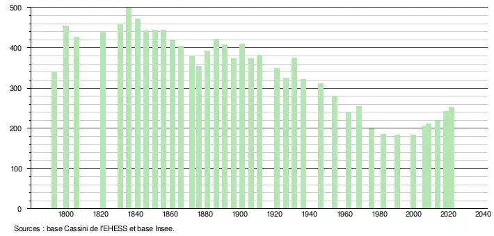 L'évolution du nombre d'habitants est connue à travers les recensements de la population effectués dans la commune depuis 1793. Pour les communes de moins de 10 000 habitants, une enquête de recensement portant sur toute la population est réalisée tous les cinq ans, les populations légales des années intermédiaires étant quant à elles estimées par interpolation ou extrapolation[23]. Pour la commune, le premier recensement exhaustif entrant dans le cadre du nouveau dispositif a été réalisé en 2008[24].