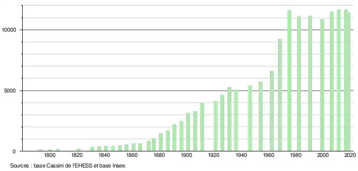 2. Par convention dans Wikipédia, le principe a été retenu de n’afficher dans le tableau des recensements et le graphique, pour les populations légales postérieures à 1999, que les populations correspondant à une enquête exhaustive de recensement pour les communes de moins de 10 000 habitants, et que les populations des années 2006, 2011, 2016, etc. pour les communes de plus de 10 000 habitants, ainsi que la dernière population légale publiée par l’Insee pour l'ensemble des communes.