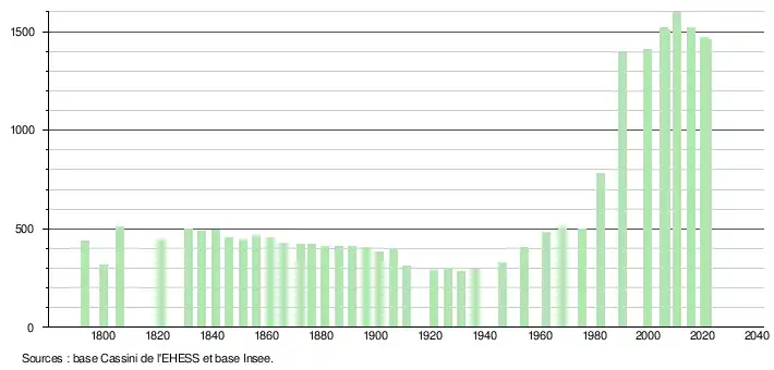 L'évolution du nombre d'habitants est connue à travers les recensements de la population effectués dans la commune depuis 1793. Pour les communes de moins de 10 000 habitants, une enquête de recensement portant sur toute la population est réalisée tous les cinq ans, les populations légales des années intermédiaires étant quant à elles estimées par interpolation ou extrapolation[37]. Pour la commune, le premier recensement exhaustif entrant dans le cadre du nouveau dispositif a été réalisé en 2005[38].