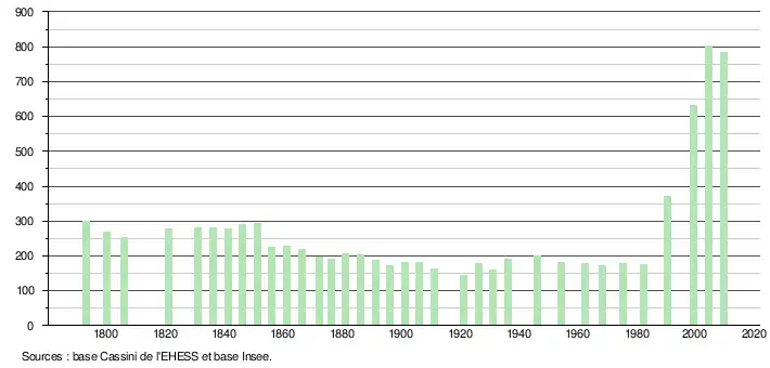 L'évolution du nombre d'habitants est connue à travers les recensements de la population effectués dans la commune depuis 1793. À partir du , les populations légales des communes sont publiées annuellement dans le cadre d'un recensement qui repose désormais sur une collecte d'information annuelle, concernant successivement tous les territoires communaux au cours d'une période de cinq ans. Pour les communes de moins de 10 000 habitants, une enquête de recensement portant sur toute la population est réalisée tous les cinq ans, les populations légales des années intermédiaires étant quant à elles estimées par interpolation ou extrapolation[8]. Pour la commune, le premier recensement exhaustif entrant dans le cadre du nouveau dispositif a été réalisé en 2004[9],[Note 1].