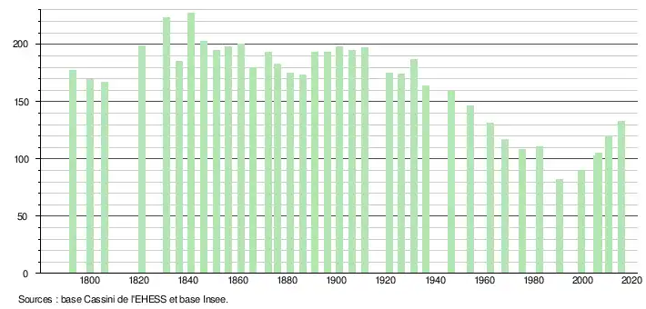 L'évolution du nombre d'habitants est connue à travers les recensements de la population effectués dans la commune depuis 1793. Pour les communes de moins de 10 000 habitants, une enquête de recensement portant sur toute la population est réalisée tous les cinq ans, les populations légales des années intermédiaires étant quant à elles estimées par interpolation ou extrapolation[3]. Pour la commune, le premier recensement exhaustif entrant dans le cadre du nouveau dispositif a été réalisé en 2005[4].