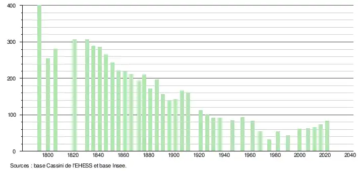 | L'évolution du nombre d'habitants est connue à travers les recensements de la population effectués dans la commune depuis 1793. Pour les communes de moins de 10 000 habitants, une enquête de recensement portant sur toute la population est réalisée tous les cinq ans, les populations légales des années intermédiaires étant quant à elles estimées par interpolation ou extrapolation[43]. Pour la commune, le premier recensement exhaustif entrant dans le cadre du nouveau dispositif a été réalisé en 2006[44]. En 2021, la commune comptait 83 habitants[Note 7], en augmentation de 18,57 % par rapport à 2015 (Ariège : +1,38 %, France hors Mayotte : +1,84 %). |