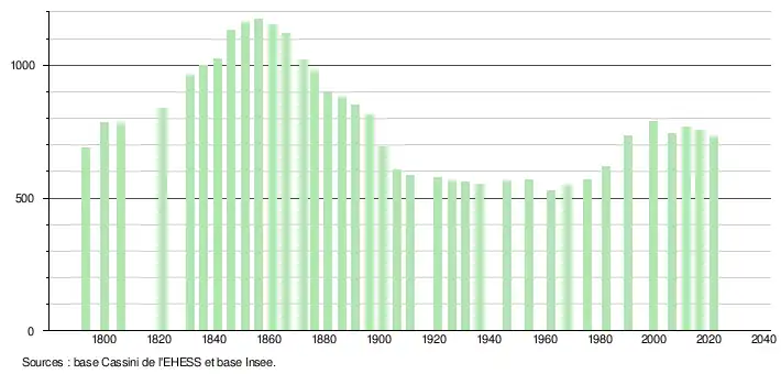 L'évolution du nombre d'habitants est connue à travers les recensements de la population effectués dans la commune depuis 1793. Pour les communes de moins de 10 000 habitants, une enquête de recensement portant sur toute la population est réalisée tous les cinq ans, les populations légales des années intermédiaires étant quant à elles estimées par interpolation ou extrapolation[22]. Pour la commune, le premier recensement exhaustif entrant dans le cadre du nouveau dispositif a été réalisé en 2006[23].