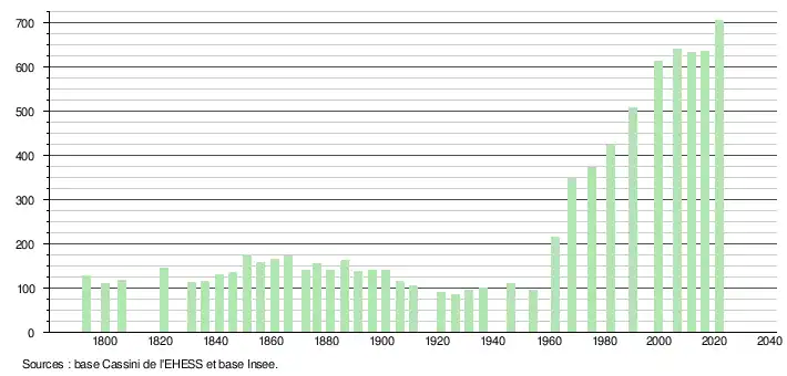 L'évolution du nombre d'habitants est connue à travers les recensements de la population effectués dans la commune depuis 1793. Pour les communes de moins de 10 000 habitants, une enquête de recensement portant sur toute la population est réalisée tous les cinq ans, les populations légales des années intermédiaires étant quant à elles estimées par interpolation ou extrapolation[18]. Pour la commune, le premier recensement exhaustif entrant dans le cadre du nouveau dispositif a été réalisé en 2006[19].