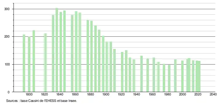 L'évolution du nombre d'habitants est connue à travers les recensements de la population effectués dans la commune depuis 1793. Pour les communes de moins de 10 000 habitants, une enquête de recensement portant sur toute la population est réalisée tous les cinq ans, les populations légales des années intermédiaires étant quant à elles estimées par interpolation ou extrapolation[24]. Pour la commune, le premier recensement exhaustif entrant dans le cadre du nouveau dispositif a été réalisé en 2008[25].