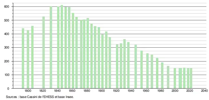 | L'évolution du nombre d'habitants est connue à travers les recensements de la population effectués dans la commune depuis 1793. Pour les communes de moins de 10 000 habitants, une enquête de recensement portant sur toute la population est réalisée tous les cinq ans, les populations légales des années intermédiaires étant quant à elles estimées par interpolation ou extrapolation[27]. Pour la commune, le premier recensement exhaustif entrant dans le cadre du nouveau dispositif a été réalisé en 2007[28]. En 2021, la commune comptait 150 habitants[Note 3], en diminution de 0,66 % par rapport à 2015 (Gers : +0,79 %, France hors Mayotte : +1,84 %). |