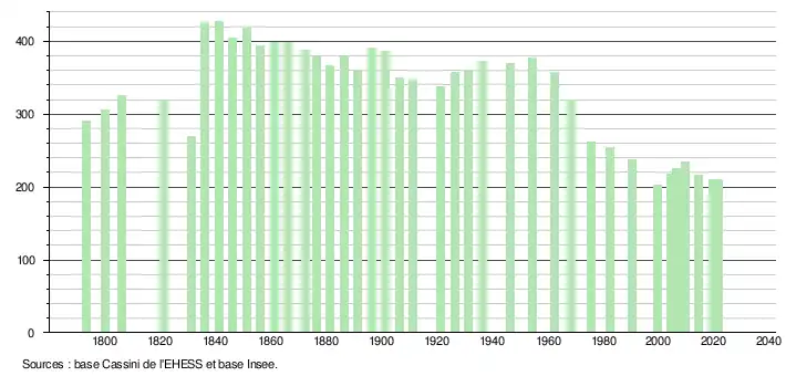 L'évolution du nombre d'habitants est connue à travers les recensements de la population effectués dans la commune depuis 1793. Pour les communes de moins de 10 000 habitants, une enquête de recensement portant sur toute la population est réalisée tous les cinq ans, les populations légales des années intermédiaires étant quant à elles estimées par interpolation ou extrapolation[20]. Pour la commune, le premier recensement exhaustif entrant dans le cadre du nouveau dispositif a été réalisé en 2004[21].