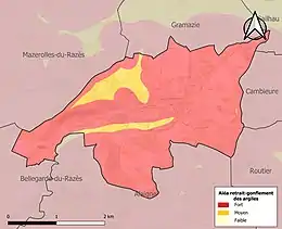 Le retrait-gonflement des sols argileux est susceptible d'engendrer des dommages importants aux bâtiments en cas d’alternance de périodes de sécheresse et de pluie. La totalité de la commune est en aléa moyen ou fort (75,2 % au niveau départemental et 48,5 % au niveau national). Sur les 534 bâtiments dénombrés sur la commune en 2019, 534 sont en aléa moyen ou fort, soit 100 %, à comparer aux 94 % au niveau départemental et 54 % au niveau national. Une cartographie de l'exposition du territoire national au retrait gonflement des sols argileux est disponible sur le site du BRGM[21],[Carte 3].