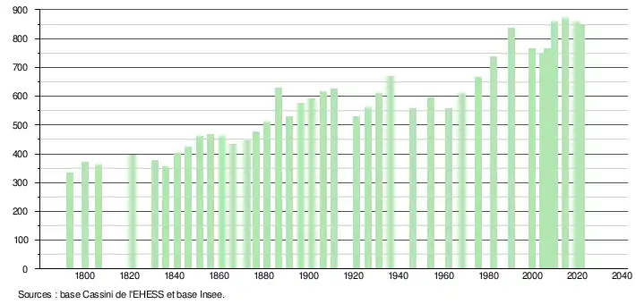L'évolution du nombre d'habitants est connue à travers les recensements de la population effectués dans la commune depuis 1793. Pour les communes de moins de 10 000 habitants, une enquête de recensement portant sur toute la population est réalisée tous les cinq ans, les populations légales des années intermédiaires étant quant à elles estimées par interpolation ou extrapolation[26]. Pour la commune, le premier recensement exhaustif entrant dans le cadre du nouveau dispositif a été réalisé en 2004[27].