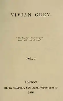 L'éclatement de la bulle ruina Disraeli et en juin 1825, ses associés et lui avaient perdu 7 000 £ (environ 574 000 £ de 2011[16]) ; Disraeli ne remboursa complètement sa dette qu'en 1849[43]. Il revint alors à l'écriture pour essayer d'obtenir de l'argent et pour prendre sa revanche sur Murray et ceux qui, selon lui, l'avaient abandonné[44]. À cette époque, le genre littéraire en vogue était la silver-fork fiction (« fiction de la cuillère en argent ») mettant en scène la vie de l'aristocratie dans des romans généralement rédigés anonymement et destinés aux classes moyennes[45],[44]. En 1826 et 1827, Disraeli publia anonymement les quatre volumes de son premier roman Vivian Grey qui se basait largement sur l'échec du Representative[46]. Les ventes furent satisfaisantes mais l'œuvre fit scandale dans les cercles littéraires quand l'identité de son auteur fut découverte[46]. Les nombreux solécismes démontraient que Disraeli, alors âgé de seulement 23 ans, n'évoluait pas dans la haute-société et les critiques furent sévères. De plus, Murray et Lockhart, qui disposaient d'une grande influence dans les cercles littéraires, estimèrent qu'ils avaient été caricaturés et trompés ; ces accusations furent rejetées par l'auteur mais reprises par beaucoup de ses biographes[47],[48],[49],[50],[51]. Dans les éditions ultérieures, Disraeli apporta de nombreuses modifications au texte pour adoucir la satire mais sa réputation en fut longuement ternie[43].