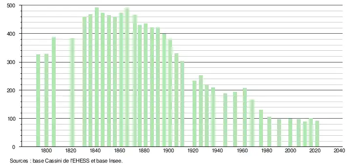 L'évolution du nombre d'habitants est connue à travers les recensements de la population effectués dans la commune depuis 1793. Pour les communes de moins de 10 000 habitants, une enquête de recensement portant sur toute la population est réalisée tous les cinq ans, les populations légales des années intermédiaires étant quant à elles estimées par interpolation ou extrapolation[16]. Pour la commune, le premier recensement exhaustif entrant dans le cadre du nouveau dispositif a été réalisé en 2006[17].
