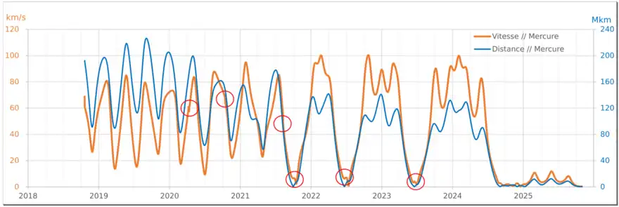 | Vitesse (km/s) et distance (millions de kilomètres) par rapport à Mercure de BepiColombo entre le (lancement) et fin 2025 (insertion en orbite autour de la planète) durant son transit entre la Terre et Mercure. Les cercles rouges correspondent aux survols de planète (avec assistance gravitationnelle). | ||