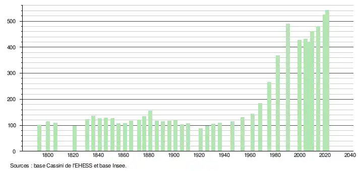 L'évolution du nombre d'habitants est connue à travers les recensements de la population effectués dans la commune depuis 1793. Pour les communes de moins de 10 000 habitants, une enquête de recensement portant sur toute la population est réalisée tous les cinq ans, les populations légales des années intermédiaires étant quant à elles estimées par interpolation ou extrapolation[18]. Pour la commune, le premier recensement exhaustif entrant dans le cadre du nouveau dispositif a été réalisé en 2004[19].