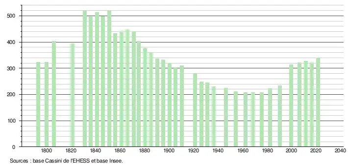 L'évolution du nombre d'habitants est connue à travers les recensements de la population effectués dans la commune depuis 1793. Pour les communes de moins de 10 000 habitants, une enquête de recensement portant sur toute la population est réalisée tous les cinq ans, les populations légales des années intermédiaires étant quant à elles estimées par interpolation ou extrapolation[16]. Pour la commune, le premier recensement exhaustif entrant dans le cadre du nouveau dispositif a été réalisé en 2006[17].