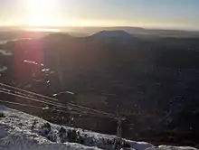 Bergensdalen au premier plan, Løvstakken au centre, Store Lungegardsvannet, Bergenhus et Fløyen à droite.