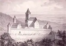 Château de Landsberg aux XVIe et XVIIe siècles, lithographie veuve Berger-Levrault et Fils (1854-1858[13]), d'après les études de Friess, architecte de Strasbourg.