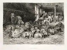 Gravure d'Albert Brendel représentant une bergerie comme il en existait au milieu du XIXe siècle en Europe