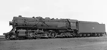 Selon la notation de Whyte, 2-8-4 est une locomotive à vapeur dont la disposition d'essieux en partant de l'avant vers l'arrière correspond à un essieu porteur, quatre essieux moteurs et deux essieux porteurs.