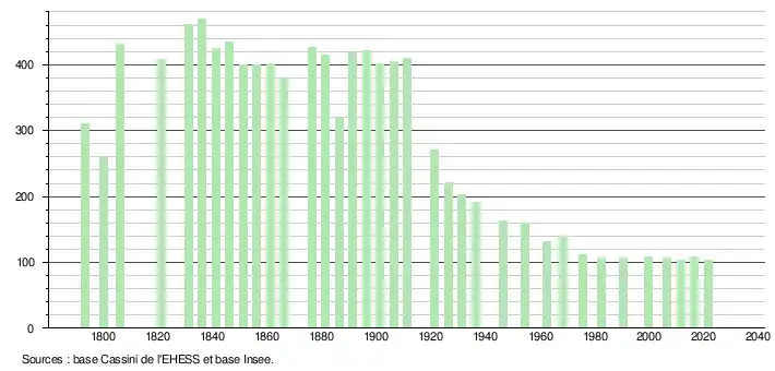 | L'évolution du nombre d'habitants est connue à travers les recensements de la population effectués dans la commune depuis 1793. Pour les communes de moins de 10 000 habitants, une enquête de recensement portant sur toute la population est réalisée tous les cinq ans, les populations légales des années intermédiaires étant quant à elles estimées par interpolation ou extrapolation[25]. Pour la commune, le premier recensement exhaustif entrant dans le cadre du nouveau dispositif a été réalisé en 2006[26]. En 2021, la commune comptait 103 habitants[Note 3], en diminution de 2,83 % par rapport à 2015 (Hautes-Pyrénées : +1,04 %, France hors Mayotte : +1,84 %). |