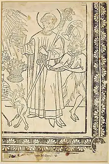 | Attributs | Bourdon d'archidiacre, aumusse, étole qui se transforme en chaîne, diable enchaîné, colonnes en arrière-fond, tête de Jupiter |