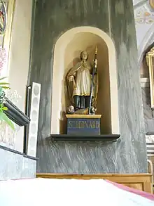 Cette statue polychrome non datée, inspirée le l'iconographie dominante du saint remplace l'aumusse par le camail, obtenu par les chanoines en 1674.